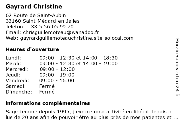 1 Maître Christine Saint-Germain Peny - Avocate (Distance: 0,70 km) 47 Avenue Montesquieu, 33160 Saint-Medard en Jalles avocate, avocats, christine, civils, droits, germain, juridiques, maître, peny, saint 2 Dr Marie-Christine Bayle - Médecin généraliste (Distance: 1,32 km) 9 bis Route de Saint-Médard, 33160 Saint-Aubin-de-Médoc bayle, christine, docteur, dr, generaliste, généraliste, marie, medical, médecin, soin 3 Marie Février-Gayrard - Masseur-kinésithérapeute (Distance: 4,17 km) 55 Avenue de Soulac, 33320 Le Taillan-Médoc docteur, février, gayrard, kine, kinesitherapeute, kinésithérapeute, marie, masseur 4 Dr Gaillardou Christine - Gynécologue-Obstétricien (Distance: 8,81 km) 1 Avenue Charles de Gaulle, 33520 Bruges accouchement, christine, dr, gaillardou, grossesse, gynécologue, infertilité, médecin, obstétricien 5 Salon Christine M (Distance: 10,23 km) 111 Rue du velodrome, 33200 Bordeaux béaute, christine, coiffure, cosmétiques, coupes, personnels, salon, soins 6 Dr Christine Murcia Médecin généraliste (Distance: 10,91 km) 526 Avenue de Bordeaux, 33127 Saint-Jean-d'Illac christine, dr, généraliste, murcia, médecin, médecine, médical, pharmaceutique, traitement |