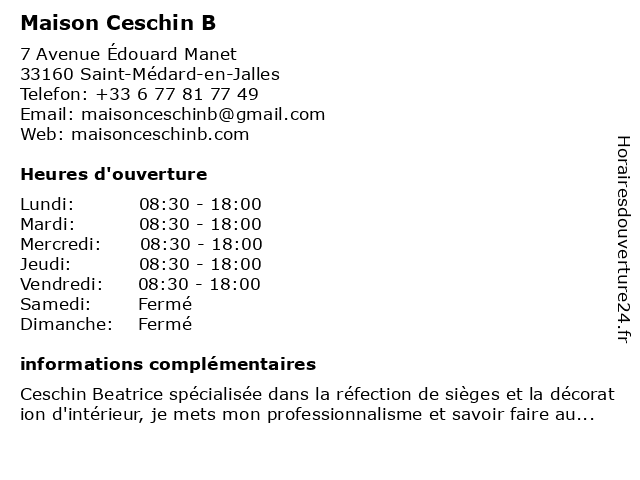 1 Casa (Distance: 0,73 km) - Avenue Descartes, 33160 Saint-Médard-en-Jalles ameublement, casa, cuisine, déco, maison, vaisselle 2 AXA Assurance et Banque Arnaud Bouquet (Distance: 0,92 km) 58 Avenue Montaigne, 33160 Saint-Médard-en-Jalles arnaud, assurance, assurance appartement, assurance auto, assurance entreprise, assurance epargne, assurance habitation, assurance maison, assurance professionnelle, assurance santé, assurance voiture, axa, banque, bouquet, et 3 Multi accueil Maison de La Petite Enfance (Distance: 1,55 km) 23 Rue Jean Dupérier, 33160 St Medard En Jalles accueil, caregivers houses, child care, de, enfance, family home, home care, kindergartens, la, maison, micro-nurseries, multi, parental home, petite 4 GIB Construction (Distance: 1,92 km) 144 Avenue Pasteur, 33185 Le Haillan agence, constructeur, construction, gib, immobilier, maison, projet 5 FDB peinture revêtements sols & murs (Distance: 2,19 km) 7 Rue François Mitterand, 33160 Saint-Médard-en-Jalles appartement, fdb, maison, murs, peintre en bâtiment, peinture, revêtements, sols, spécialiste 6 Trecobat (Distance: 2,21 km) 43 rue François Mitterrand, 33160 Saint Médard en Jalles constructeur, de, maison, trecobat |