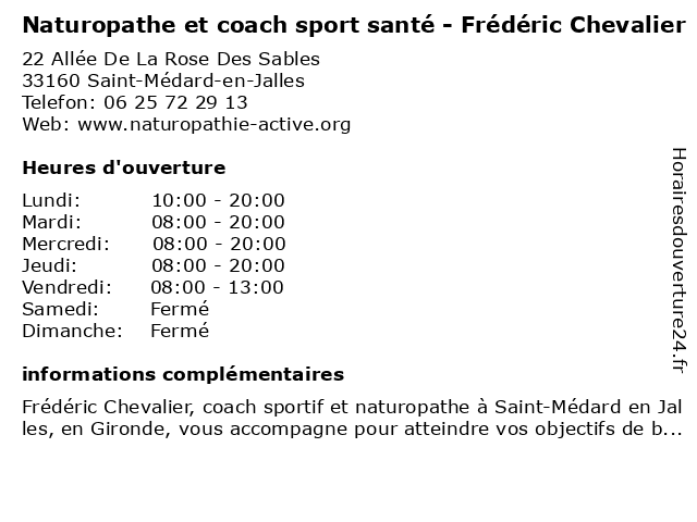 1 Dr Vincent Boulestreau - Médecin du sport (Distance: 0,33 km) 65 Avenue Voltaire, 33160 Saint-Médard-en-Jalles boulestreau, consultation, docteur, domicile, dr, du, en, générale, medecins, médecin, médecine, santé, sport, vincent, visite 2 Pomiès Frédéric (Distance: 2,64 km) 89 Route de Saint-Médard, 33160 Saint-Aubin-de-Médoc frédéric, pomiès 3 Habitat & Santé (Distance: 3,23 km) 49 Route de Loustaou Vieil, 33160 Saint-Aubin-de-Médoc habitat, santé 4 Dr. Josselin Laffond - Medecine du Sport (Distance: 3,88 km) 15 Avenue Denis Papin, 33160 Saint Médard en Jalles consultation, docteur, dr., du, josselin, laffond, medecine, santé, sport 5 Scagliarini Frédéric (Distance: 4,89 km) 6 Allée des Trembles, 33127 Martignas-sur-Jalle frédéric, scagliarini 6 Samira Chaudet - Naturopathe (Distance: 8,34 km) 1067 Allée de Senejac, 33290 Le Pian-Médoc chaudet, medecin, naturopathe, plante, samira, sante |