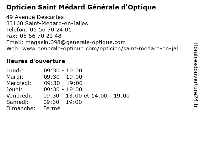 1 Opticien Saint-Médard-en-Jalles - Optic 2000 (Distance: 0,22 km) 37 Avenue Descartes, 33160 Saint-Médard-en-Jalles 2000, en, jalles, lentilles de contact, lunettes de soleil, lunettes de vue, médard, optic, optic2000, opticien, opticien optic2000, ray-ban, rayban, saint 2 Opticien Krys (Distance: 0,23 km) 34 Avenue René Descartes, 33160 Saint-médard-en-jalles krys, magasin de lentilles correctrices, magasin de lunettes de soleil, magasin d’accessoires de mode, opticien, optométrie 3 Opticien SAINT-MÉDARD-EN-JALLES Optical Center (Distance: 0,72 km) 2A Avenue de Berlincan, 33160 Saint-Médard-en-Jalles center, en, jalles, médard, optical, opticien, saint 4 Cabinet Rollet Leherle Schetter - Médecine générale (secrétariat) (Distance: 0,91 km) 10 Chemin Lafon, 33160 Saint Medard En Jalles cabinet, consultation, docteur, générale, leherle, médecine, rollet, santé, schetter, secrétariat 5 Société Générale (Distance: 1,68 km) 8 RUE EMILE VIDEAU, 33185 LE HAILLAN agence, devis d'assurance automobile, générale, prêt à domicile, prêt à la consommation, société 6 Atol Mon Opticien Saint-Médard-En-Jalles (Distance: 2,15 km) 3 Rue Francis Poulenc, 33160 Saint-Médard-en-Jalles atol, atol les opticiens, atol mon opticien, en, jalles, lentilles, lunettes de soleil, lunettes de vue, mon, médard, opticien, opticien saint-médard-en-jalles, saint |