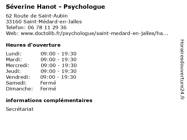 1 Dr Séverine Ducos-Klingebiel - Médecin généraliste (Distance: 2,48 km) 6 Route de Feydit, 33160 Saint-Médard-en-Jalles docteur, dr, ducos, généraliste, klingebiel, médecin, santé, séverine 2 Séverine Deschamps - Hypnothérapeute (Distance: 8,26 km) 11 Rue des Bleuets, 33200 Bordeaux deschamps, hypnose, hypnotherapeute, hypnothérapeute, sante, soins, séverine 3 Maître Séverine Fau-Pullicino - Avocate (Distance: 10,60 km) 33 Rue Raymond Poincaré, 33110 Le Bouscat avocate, avocats, civils, droits, fau, juridiques, maître, pullicino, séverine 4 Maître Séverine Fau-Pullicino - Avocate (Distance: 10,60 km) 33 rue Raymond Poincaré, 33110 Le Bouscat avocate, avocats, civils, droits, fau, juridiques, maître, pullicino, séverine 5 Séverine Peronneau - Naturopathe (Distance: 11,00 km) 63 Rue de Malbos, 33700 Mérignac medecin, naturopathe, peronneau, plante, sante, séverine 6 Séverine Fourton - Masseur-kinésithérapeute (Distance: 11,37 km) 2 Allée des Conviviales, 33700 Mérignac cabinet, conviviales, de, fourton, kiné, kinésithérapeute, kinésithérapie, masseur, mme, rééducation, soin, séverine |