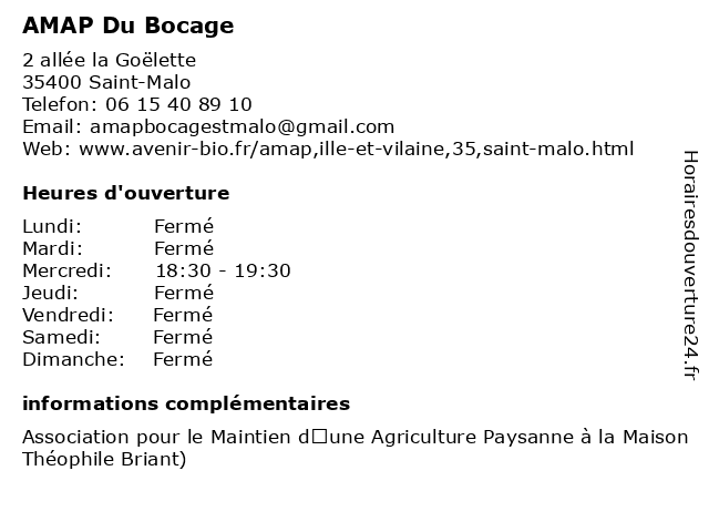 1 AMAP Des 4 Vents (Distance: 2,86 km) - place de la grande Hermine, 35400 Saint-Malo alimentation, amap, des, fruits, légumes, primeurs, producteur, vents 2 Bocage (Distance: 3,55 km) 10 Rue Saint Vincent, 35400 Saint-Malo bocage, boutique, chaussures, femme, homme, maroquinerie 3 Bocage (Distance: 3,62 km) 7 Rue Porcon de la Barbinais, 35400 Saint-Malo bocage, boutique, chaussures, femme, homme, maroquinerie 4 AMAP Part de Marché (Distance: 4,13 km) - Avenue des Comptoirs, 35400 Saint-Malo alimentation, amap, de, fruits, légumes, marché, part, primeurs, producteur 5 Collège Public le Bocage (Distance: 7,66 km) 27 rue Gouyon Matignon, 35800 Dinard bocage, cio, collège, cours, enseignement, le, lycée, maternelle, orientation, primaire, privée, public, publique, école, éducation, élémentaire 6 AMAP Entre Terre & Mer (Distance: 9,61 km) 44 rue du Port, 35260 Cancale alimentation, amap, entre, fruits, légumes, mer, primeurs, producteur, terre |