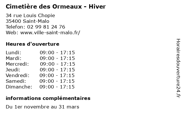1 Cimetière des Ormeaux - Eté (Distance: 0,00 km) 34 rue Louis Chopie, 35400 Saint-Malo cercueil, cimetiere, cimetière, des, deuil, eté, mort, ormeaux 2 Cimetière de Paramé - Eté (Distance: 1,20 km) - boulevard des Déportés, 35400 Saint-Malo cercueil, cimetiere, cimetière, de, deuil, eté, mort, paramé 3 Cimetière de Rocabey - Eté (Distance: 1,74 km) 34 avenue de Moka, 35400 Saint-Malo cercueil, cimetiere, cimetière, de, deuil, eté, mort, rocabey 4 Cimetière de Rocabey - Hiver (Distance: 1,74 km) 34 avenue de Moka, 35400 Saint-Malo cercueil, cimetiere, cimetière, de, deuil, hiver, mort, rocabey 5 Cimetière de Lorette - Eté (Distance: 2,63 km) - rue du Tertre Belot, 35400 Saint-Malo cercueil, cimetiere, cimetière, de, deuil, eté, lorette, mort 6 Cimetière de Lorette - Hiver (Distance: 2,63 km) - rue du Tertre Belot, 35400 Saint-Malo cercueil, cimetiere, cimetière, de, deuil, hiver, lorette, mort |