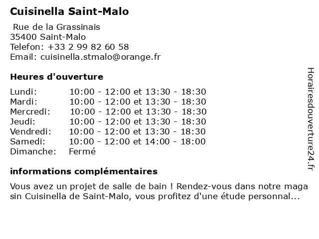 1 Cuisinella (Distance: 53,33 km) 52 Route du Meuble, 35760 Saint-Grégoire aménagement, cuisinella, cuisines, cuisiniste, meubles, électroménager, équipement 2 Cuisinella (Distance: 56,70 km) 17 Rue Jules Verne, 22360 Langueux aménagement, cuisinella, cuisines, cuisiniste, meubles, électroménager, équipement |