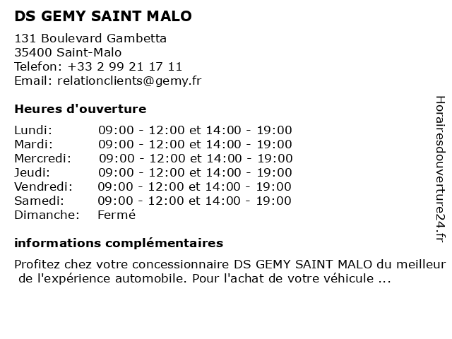 1 Citroën GEMY SAINT MALO (Distance: 0,03 km) 131 Boulevard Gambetta, 35400 Saint-Malo citroën, gemy, malo, saint 2 TotalEnergies - ENERGIES GEMY ST MALO (Distance: 0,06 km) 131 BLD GAMBETTA, 35400 SAINT MALO energies, gas station, gemy, malo, st, station service, tankstelle, total, totalenergies 3 Citroën GEMY DINARD (Distance: 5,87 km) Rue des Villes Billy, 35780 La Richardais citroën, dinard, gemy 4 Peugeot GEMY Plouer (Distance: 13,16 km) Rue de la Croix Corbin, 22490 Plouër-sur-Rance gemy, peugeot, plouer 6 Peugeot GEMY Matignon (Distance: 22,59 km) 1 Rue du Colonel Charles le Coq, 22550 Matignon gemy, matignon, peugeot |