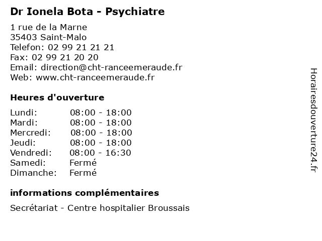1 Dr Frédéric Boillat - Psychiatre (Distance: 0,00 km) 1 rue de la Marne, 35403 Saint-Malo boillat, consultation, docteur, dr, frédéric, med, médecin, médecine, psychiatre, psychiatrie, traitement 2 Dr Laurence Aulnette - Psychiatre (Distance: 0,00 km) 1 rue de la Marne, 35403 Saint-Malo aulnette, consultation, docteur, dr, laurence, med, médecin, médecine, psychiatre, traitement 3 Dr Marc Briand - Psychiatre (Distance: 0,00 km) 1 rue de la Marne, 35403 Saint-Malo briand, consultation, docteur, dr, marc, med, médecin, médecine, psychiatre, traitement 4 Dr Loredana-Cristina Buftea - Psychiatre (Distance: 0,00 km) 1 rue de la Marne, 35403 Saint-Malo buftea, consultation, cristina, docteur, dr, loredana, med, médecin, médecine, psychiatre, traitement 5 Dr Michele Defossez - Psychiatre (Distance: 0,00 km) 1 rue de la Marne, 35403 Saint-Malo consultation, defossez, docteur, dr, med, michele, médecin, médecine, psychiatre, traitement 6 Dr Sophie Froehlich - Psychiatre (Distance: 0,00 km) 1 rue de la Marne, 35403 Saint-Malo consultation, docteur, dr, froehlich, med, médecin, médecine, psychiatre, sophie, traitement |