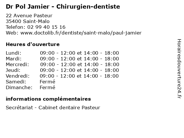 1 Dr Murielle Massot Chirurgien oral - secrétariat (Distance: 0,49 km) 2 Rue de l'Abbé Huchet, 35400 Saint-Malo chirurgien, consultation, dentiste, docteur, dr, massot, med, murielle, oral, secrétariat 2 Dr Bertrand Laur - Orthodontiste (Distance: 0,59 km) 36 Boulevard Villebois Mareuil, 35400 St Malo bertrand, dentaire, dr, implantologie, laur, orthodontiste, parodontologie 3 Centre de Santé Dentaire Mutualiste (Distance: 0,88 km) 18 Avenue Jean Jaurès, 35400 Saint Malo centre, de, dentaire, docteur, medecins, mutualiste, sante, santé 4 Dr Pierre Le Bever - Chirurgien-dentiste (Distance: 1,18 km) 3 Quai Duguay-Trouin, 35400 Saint-Malo bever, chirurgien, dentaire, dentiste, dr, implantologie, le, parodontologie, pierre 5 Dr. Didier Menetray- Dentiste (Distance: 1,24 km) 3 Quai Duguay Trouin, 35400 Saint-Malo david, dentiste, didier, docteur, dr., medecins, menetray, sante, stouff 6 Centre de Santé Dentaire Mutualiste (Distance: 22,78 km) 9 Place Duclos, 22100 Dinan centre, de, dentaire, docteur, medecins, mutualiste, sante, santé |
