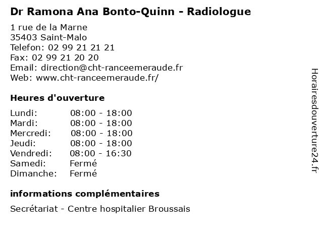 1 Dr Ramona Ana Bonto-Quinn - Radiologue (Distance: 21,70 km) 74 rue Chateaubriand, 22100 Dinan ana, bonto, consultation, docteur, dr, med, médecin, médecine, quinn, radiologue, ramona, traitement 2 Dr Ana Miguel - Ophtalmologue (Distance: 38,55 km) 23 Rue du Vieux Moulin, 50400 Granville ana, consultation, docteur, dr, med, miguel, médecin, ophtalmologue, traitement 3 Dr Ana Miguel - Ophtalmologue - secrétariat (Distance: 48,62 km) 3 Avenue du Quesnoy, 50300 Saint-Martin-des-Champs ana, consultation, docteur, dr, med, miguel, médecin, médecine, ophtalmologue, secrétariat, traitement 4 Dr Ana Miguel - Ophtalmologue (Distance: 48,64 km) 1 Avenue du Quesnoy, 50307 Saint-Martin des Champs ana, avranches, baie, de, dr, la, miguel, ophtalmologie, ophtalmologistes, ophtalmologue, polyclinique, vision 6 Ana et les Elégantes (Distance: 55,92 km) 10 rue de l'Horloge, 35160 Monfort-sur-Meu ana, boutique, du, elégantes, et, fiancee, la, les, mekong, mode, vetements |