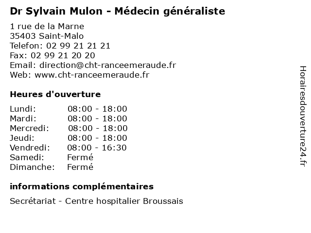 1 Dr Sylvain Le Calve - Médecin généraliste (Distance: 0,00 km) 1 rue de la Marne, 35403 Saint-Malo calve, consultation, docteur, dr, généraliste, le, med, médecin, médecine, sylvain, traitement 2 Sylvain Chartier - Pédicure-podologue (Distance: 0,70 km) 50 Rue Georges Clemenceau, 35400 Saint-Malo chartier, pedicure, pied, podologue, pédicure, sante, sylvain 3 Hasle Yvan Sylvain Louis (Distance: 7,12 km) 1 Rue Du Telegraphe, 35350 St Meloir Des Ondes hasle, louis, restaurants, sylvain, yvan 4 SELARL Maître Sylvain HELLIVAN et Maître GICQUEL HELLIVAN (Distance: 11,71 km) 4 Rue du Colonel Pléven, 22650 Beaussais-sur-Mer et, gicquel, hellivan, maître, selarl, sylvain 5 Letaconnoux Sylvain (Distance: 19,76 km) Zone Artisanale des Vergers d'Arguenon, 22130 Saint-Lormel letaconnoux, sylvain 6 |