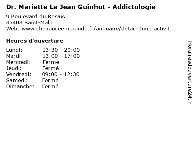 Termes de recherche pour Dr. Mariette Le Jean Guinhut - Addictologie:le, jean, santé, mariette, docteur, dr., médecins, addictologie, guinhut |