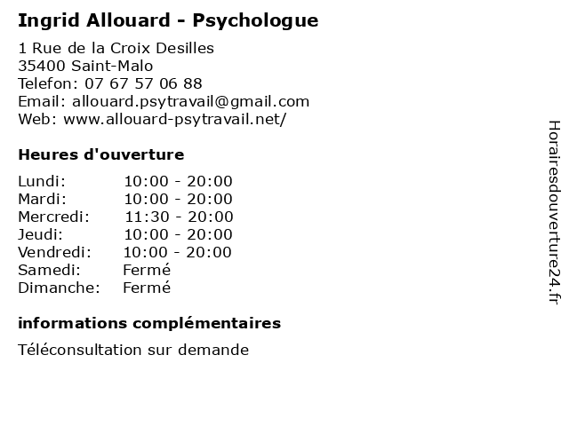 1 L 'Embarcadère (Distance: 4,07 km) 25 quai de Dinan, 35400 Saint-Malo 'embarcadère, bourgouin, embarcadere, ingrid, restaurants, stephanie 2 Ingrid Gérard - Psychologue clinicien (Distance: 20,02 km) 4 rue Pierre Flaux, 35120 Dol-de-Bretagne clinicien, gerard, gérard, ingrid, médecin, psychiatre, psychologue, psychothérapeute 4 L'Atelier d'Ingrid (Distance: 26,65 km) - Place du 19 Mars 1962, 22100 Trélivan atelier, coiffeur, coiffure, d'ingrid, ingrid, l'atelier, mixte 5 Ingrid Perussault - Sage-femme (Distance: 57,42 km) 59 Avenue d'Armorique, 35380 Betton du, femme, ingrid, maternité, perussault, périnée, rééducation, sage, uro-gynécologique 6 Isabelle Le Berre - Psychologue (Distance: 0,00 km) 1 Rue de la Croix Desilles, 35400 Saint-Malo berre, folie, isabelle, le, psychiatre, psychiatrie, psychiatrique, psychologue |