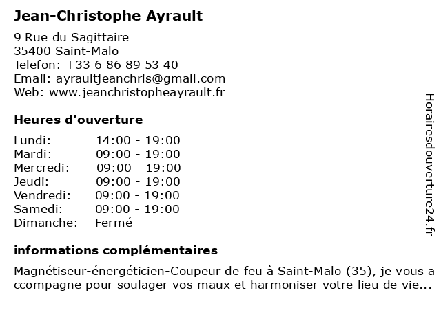 1 Latruffe Montmeylian Christophe SARL (Distance: 0,52 km) 51 Rue René Godest, 35400 Saint-Malo christophe, dépannage, latruffe, latruffe montmeylian, montmeylian, récepteur, sarl, satellite 2 Dr. Philippe Christophe - Pédiatre (Distance: 0,71 km) 11 Boulevard Léonce Demalvilain, 35400 Saint-malo christophe, docteur, dr., medecins, philippe, pédiatre, sante 3 Dr Christophe Marcel - Neurologue (Distance: 1,63 km) 1 rue de la Marne, 35403 Saint-Malo christophe, consultation, docteur, dr, marcel, med, médecin, médecine, neurologue, traitement 4 Guitton Christophe (Distance: 4,64 km) Pl Paul Crolard, 35800 Dinard boucheries, christophe, guitton, poissonneries 5 6 Dr. Christophe Sestie - Dentiste (Distance: 6,99 km) 5 Sainte Suzanne, 35350 Saint-Coulomb christophe, dentiste, docteur, dr., medecins, sante, sestie |
