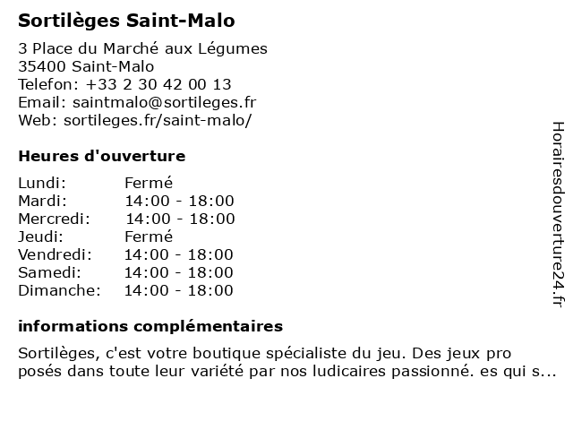 1 Sortilèges (Vacances Scolaires) (Distance: 0,00 km) 3 place du Marché aux Légumes, 35400 Saint Malo cartes, figurines, jeux, jouets, scolaires, sortilèges, vacances |