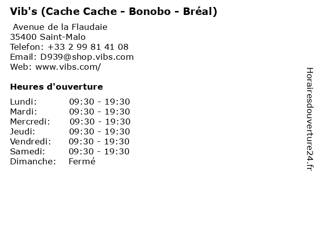 1 Vib's (Cache Cache - Bonobo - Bréal) (Distance: 0,09 km) Avenue de la Flaudaie, 35400 Saint-Malo blazer femme, bonobo, boutique vêtement, bréal, cache, cardignan femme, chaussures femme, gilet femme, jean femme, jean homme, magasin vêtement, magasin vêtements mixte, manteau femme, manteau homme, mode femme, pull femme, pull homme, robe femme, sac femme, t-shirt femme, t-shirt homme, tailleur femme, top femme, vib's, vêtement femme, vêtement homme, vêtement mixte 2 Vib's (Distance: 0,07 km) Centre Commercial LA MADELEINE Avenue de la Flaudais, 35400 SAINT-MALO femme, homme, mode, vib's, vétements 4 Bonobo (Distance: 0,13 km) . La Madeline, 35400 Saint Malo beaute, bonobo, cafe, chaussures, enfants, mode femmes, mode hommes, restaurant, sport 5 Vib (Distance: 0,35 km) . De la Haute Futaie, 35400 Saint-Malo cafe, chaussures, enfants, mode femmes, mode hommes, restaurant, sport, vib 6 Bonobo (Distance: 0,40 km) 2 Impasse De Haute Futaie, 35400 Saint-Malo bonobo, enfant, femme, homme, jeans, mode |