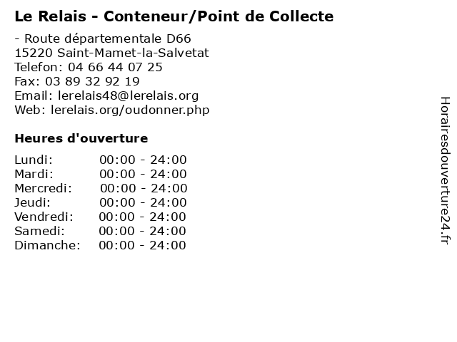1 Le Relais - Conteneur/Point de Collecte (Distance: 0,00 km) - Route départementale D66, 15220 Saint-Mamet-la-Salvetat collecte, conteneur/point, de, dons, le, point, relais, vêtements 2 Le Relais - Conteneur/Point de Collecte (Distance: 6,01 km) - Route départementale D51, 15290 Cayrols collecte, conteneur/point, de, dons, le, point, relais, vêtements 3 Le Relais - Conteneur/Point de Collecte (Distance: 6,30 km) 3 Rue des 2 Ponts, 15290 Le Rouget-Pers collecte, conteneur/point, de, dons, le, point, relais, vêtements 4 Le Relais - Conteneur/Point de Collecte (Distance: 6,35 km) 5 Place de la Mairie, 15290 Le Rouget-Pers collecte, conteneur/point, de, dons, le, point, relais, vêtements 5 Le Relais - Conteneur/Point de Collecte (Distance: 6,37 km) - Le Bourg, 15290 Le Rouget-Pers collecte, conteneur/point, de, dons, le, point, relais, vêtements 6 Le Relais - Conteneur/Point de Collecte (Distance: 6,65 km) - Rue du Moulin du Teil, 15290 Le Rouget-Pers collecte, conteneur/point, de, dons, le, point, relais, vêtements |
