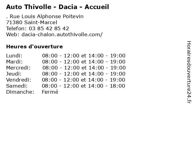 1 Auto Thivolle - Dacia - Véhicules neufs (Distance: 0,00 km) . Rue Louis-Alphonse Poitevin, 71380 Saint-Marcel auto, automobile, concessionnaire, dacia, neuf, neufs, neuve, thivolle, vente, véhicule, véhicules 2 Auto Thivolle - Renault - Accueil (Distance: 0,21 km) 2 Avenue de L'Automobile, 71100 Chalon-sur-Saône accueil, auto, automobile, concessionnaire, entretien, neuve, occasion, renault, réparation, thivolle, vente 3 Auto Thivolle - Renault - Carrosserie et mécanique (Distance: 0,21 km) 2 Avenue de L'Automobile, 71100 Chalon-sur-Saône accessoires, auto, automobile, carrosserie, entretien, et, garage, mécanique, pièces, renault, réparation, thivolle, vente, vidange 4 Auto Thivolle - Renault minute (Distance: 0,51 km) 2 Avenue de L'Automobile, 71100 Chalon-sur-Saône accueil, auto, automobile, concessionnaire, entretien, minute, neuve, occasion, renault, réparation, service, thivolle, vente 5 Fitness Park (Horaires accueil) (Distance: 0,89 km) 2 rue René Cassin, 71100 Chalon-sur-Saône accueil, club, fitness, horaires, musculation, park, sport 6 Accueil des Villes Françaises (AVF) (Distance: 2,33 km) 20 Rempart Saint-Vincent, 71100 Chalon-sur-Saône accueil, association, avf, des, françaises, informations, réseau, tourisme, villes |