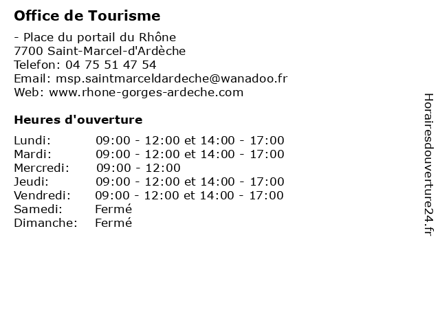 1 Office de Tourisme - Saint-Martin-d'Ardèche (Ete) (Distance: 2,61 km) . Place de l'Église, 07700 Saint-Martin-d'Ardèche bureaux, d'ardèche, de, ete, martin, office, saint, services, tourisme 2 Office de Tourisme - Saint-Martin-d'Ardèche (Hiver) (Distance: 2,61 km) . Place de l'Église, 07700 Saint-Martin-d'Ardèche bureaux, d'ardèche, de, hiver, martin, office, saint, services, tourisme 3 Office de Tourisme - Du 01/03 au 31/03 (Distance: 3,90 km) - Place de l'église, 07700 Saint-Martin-d'Ardèche 01/03, 31/03, au, de, du, horaires des musées, office, restaurants, tourisme, transports 4 Office de Tourisme - Du 01/04 au 30/06 (Distance: 3,90 km) - Place de l'église, 07700 Saint-Martin-d'Ardèche 01/04, 30/06, au, de, du, horaires des musées, office, restaurants, tourisme, transports 5 Office de Tourisme - Du 01/07 au 31/08 (Distance: 3,90 km) - Place de l'église, 07700 Saint-Martin-d'Ardèche 01/07, 31/08, au, de, du, horaires des musées, office, restaurants, tourisme, transports 6 Office de Tourisme - Du 01/09 au 30/09 (Distance: 3,90 km) - Place de l'église, 07700 Saint-Martin-d'Ardèche 01/09, 30/09, au, de, du, horaires des musées, office, restaurants, tourisme, transports |