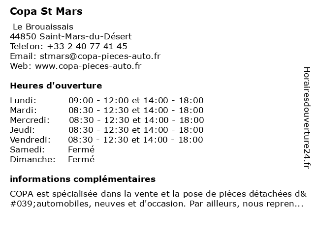 1 CarGo Location de Véhicules ST MARS DU DESERT (Distance: 1,22 km) 4 Rue du Moulin, 44850 Saint-Mars-du-Désert cargo, de, desert, du, location, mars, st, véhicules 3 Le Comptoir de St Pier (Distance: 8,76 km) 7 place Saint Pierre, 44470 Carquefou bijoux, boutique, chaussures, comptoir, de, des, le, pier, quartier, quartiers, st, vetements 4 La Villa St Germain (Distance: 10,41 km) 170 Rue Alphonse Fouschard, 44521 Oudon boisson, dîner, germain, la, nourriture, petit déjeuner, restaurant, st, villa 5 Banque Populaire Grand Ouest ST JULIEN DE CONCELLES (Distance: 12,17 km) 2 Rue du Stade, 44450 Saint-Julien-de-Concelles banque, concelles, de, grand, julien, ouest, populaire, st 6 Ecole St Vincent Ddec (Distance: 13,22 km) 6 Place Saint Exupery, 44980 Ste Luce Sur Loire ddec, ecole, loire, luce, ogec, restaurants, sainte, vincent |