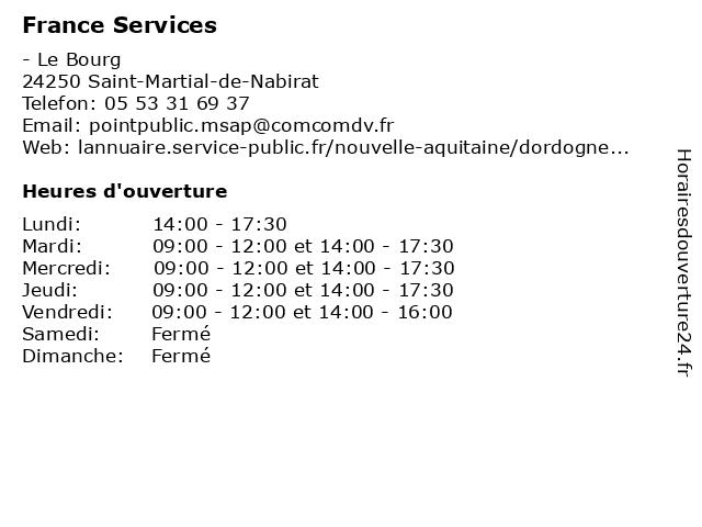1 France Services (Distance: 7,06 km) 2 place Marie-Sudres, 46340 Salviac administration, au, de, france, maison, organismes, public, publics, salviac, services 2 France Services (Distance: 10,34 km) 98 Avenue Gambetta, 46300 Gourdon administration, communes, france, service, services, services publics 3 France Services (Distance: 16,49 km) 6 Place Salvador Allende, 24200 Sarlat-la-Canéda administration, communes, france, service, services, services publics 4 Communauté de Communes - Domme Villefranche-du-Périgord (Distance: 0,04 km) - Le Bourg, 24250 Saint-Martial-de-Nabirat administration, clain, communauté, communes, de, domme, du, publics, périgord, services, villefranche 5 Communauté de communes - Cazals Salviac (Distance: 7,06 km) 5 Boulevard Hugon, 46340 Salviac administration, cazals, communauté, communes, communesn, de, salviac, services publics 6 Garage Les Prades (Distance: 7,22 km) - Route de Cazals, 46340 Salviac auto, automobile, automobiles, entretien, france, garage, les, pneu, prades, réparation, voiture, véhicule |