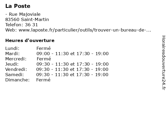 1 La Poste (Distance: 2,75 km) - Grand Rue, 83560 Esparron agence postale, courrier postal, expédition internationale, la, poste 2 La Poste (Distance: 8,50 km) - Cours Roux de Corse, 83119 Brue-Auriac agence postale, courrier postal, expédition internationale, la, poste 3 La Poste (Distance: 10,44 km) 1 Route de Barjols, 83670 Tavernes agence, colis, courriers, expédition, la, postale, poste, relais 4 La Poste (Distance: 11,90 km) - Rue Saint-Pierre, 83560 Saint-Julien agence, assurance, banque, banque postale, bureau de poste, chronopost, colis, courrier, dps, expéditions internationales, la, point, postale, poste, relais, timbres, téléphonie, ups, western union 5 La Poste (Distance: 12,52 km) - Place des Martyrs du Bessillon, 83670 Pontevès agence postale, courrier postal, expédition internationale, la, poste 6 |