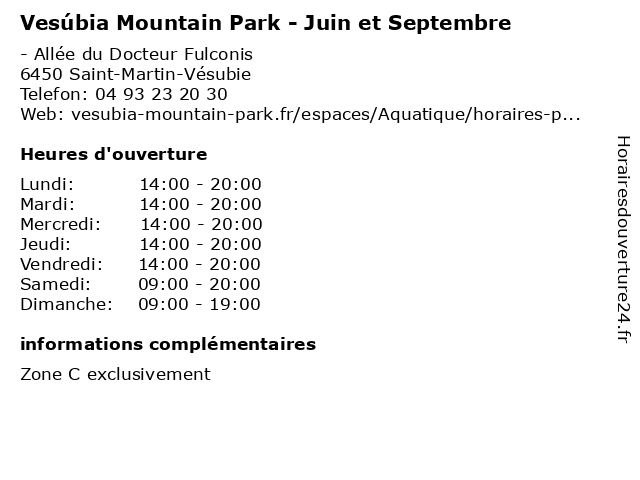 1 Vesúbia Mountain Park - Période scolaire (Distance: 0,00 km) - Allée du Docteur Fulconis, 06450 Saint-Martin-Vésubie aqua, aquatique, mountain, park, piscine, période, scolaire, vesúbia 2 Vesúbia Mountain Park - Vacances scolaires (Distance: 0,00 km) - Allée du Docteur Fulconis, 06450 Saint-Martin-Vésubie aqua, aquatique, mountain, park, piscine, scolaires, vacances, vesúbia 3 Vesúbia Mountain Park - Eté (Distance: 0,00 km) - Allée du Docteur Fulconis, 06450 Saint-Martin-Vésubie aqua, aquatique, eté, mountain, park, piscine, vesúbia 4 Fédération départementale pour la pêche et la protection du milieu aquatique (Distance: 37,08 km) n/a Chemin de Saint-Roman, 06200 Nice aquatique, du, départementale, et, fédération, la, milieu, pour, protection, pêche 5 Pêche et Protection du Milieu Aquatique (Distance: 45,10 km) 455 Promenade des Anglais, 06200 Nice administration, aquatique, assoc, du, et, milieu, protection, pêche, services, services publics 6 Piscine Municipale - période scolaire (Distance: 45,62 km) - Avenue Marcel Pagnol, 06800 Cagnes-sur-Mer aqua, aquatique, municipale, piscine, période, scolaire |