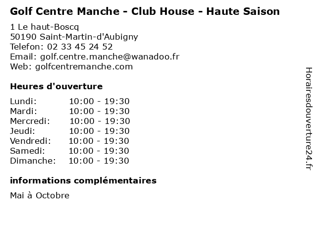 Termes de recherche pour Golf Centre Manche - Club House - Haute Saison:du, d'ouverture, horaires, centre, sport, club, sports, 1er, house, saison, 31, golf, sportif, manche, mai, haute, octobre |