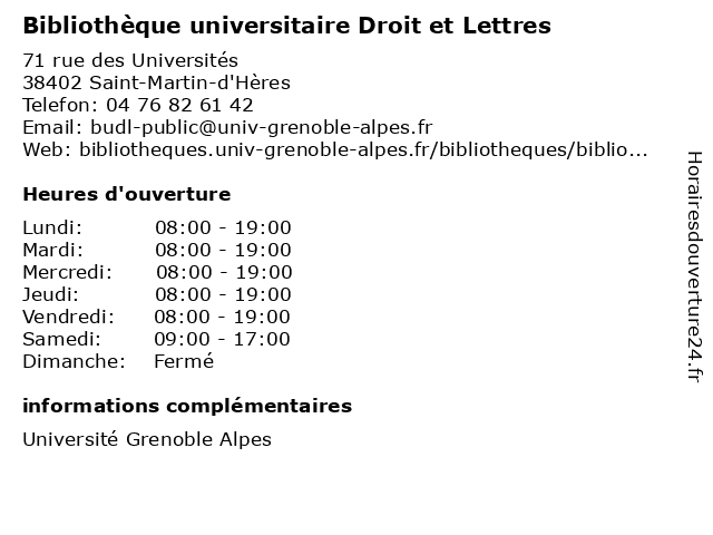 1 Bibliothèque du Département des Sciences du Langage de l'UFR LLASIC (Distance: 0,28 km) 1180 Avenue Centrale, 38400 Saint Martin d'Hères bibliothèque, de, des, du, département, l'ufr, langage, livre, llasic, médiathèque, sciences, services, université 2 Bibliothèque de l'UFR de Langues Etrangères (Distance: 0,37 km) 1381 Rue des Résidences, 38400 Saint Martin d'Hères bibliothèque, de, etrangères, l'ufr, langues, livre, médiathèque, services, université 3 Bibliothèque du Département des Lettres et Arts du Spectacle de l'UFR LLASIC (Distance: 0,79 km) . Avenue Centrale, 38400 Saint Martin d'Hères arts, bibliothèque, de, des, du, département, et, l'ufr, lettres, livre, llasic, médiathèque, services, spectacle, université 4 Centre de Santé Universitaire Michel Zorman (Distance: 0,80 km) 180 Rue de la Piscine, 38400 Saint-Martin-d'Hères campus, centre, d'hères, de, du, famille, martin, michel, médical, saint, santé, travail, universitaire, zorman 5 Service Médico-Psychologique Universitaire (SMPU) (Distance: 1,36 km) Avenue Benoît Frachon, 38400 Saint-Martin-d'Hères médico, psychologique, service, smpu, universitaire 6 Bibliothèque Simone-Lagrange / Mi-Plaine (Distance: 1,95 km) 14 rue des Aiguinards, 38240 Meylan bandes dessinées, bibliothèque, comics, horaires, hors, jeunesse, lagrange, littérature générale, mi, plaine, scolaires, simone, vacances |