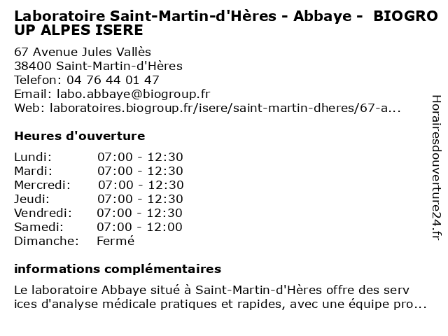 Termes de recherche pour Laboratoire Saint-Martin-d'Hères - Abbaye - BIOGROUP ALPES ISERE:saint, martin, laboratoire, alpes, abbaye, isere, d'hères, biogroup, dépistages, laboratoire de diagnostic |