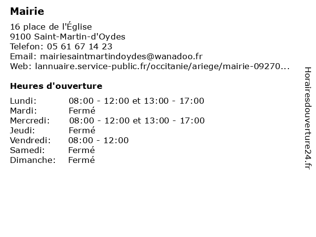 | Lundi | 08:00-12:00 et 13:00-17:00 |