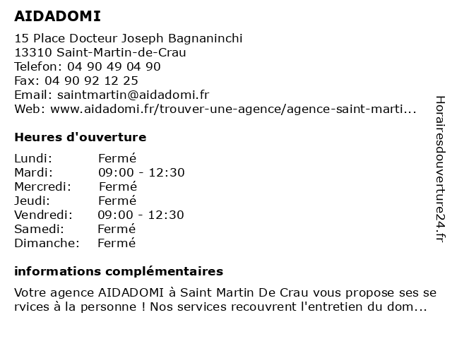 2 AIDADOMI (Distance: 17,32 km) Avenue de la 1ère Dfl, 13210 Saint-Rémy-de-Provence aidadomi, aide, domicile, soutiens 3 AIDADOMI (Distance: 19,98 km) 34 Boulevard Paul Painlevé, 13800 Istres aidadomi, aide, domicile, soutiens 4 ANDEVA - Association Nationale de Défense des Victimes de l'Amiante (Distance: 19,47 km) - Chemin de Tartugue, 13800 Istres amiante, andeva, association, de, des, dons, défense, l'amiante, nationale, soutiens, victimes 5 AIDADOMI (Distance: 22,96 km) 40 Rue Beauvezet, 13300 Salon-de-Provence aidadomi, aide, domicile, soutiens 6 Aidadomi (Distance: 27,82 km) 26 avenue du port, 13230 Port-Saint-Louis-du-Rhône agence, aidadomi, aide, domicile, santé, soutiens  |