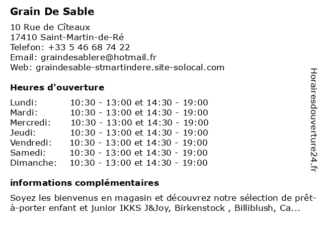 | Dimanche | 10:30-13:00 et 14:30-19:00 |