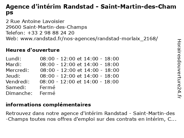 1 Agence d'Intérim Manpower Espace Morlaix (Distance: 1,07 km) 2 Rue du Puits, 29600 Saint-Martin-des-Champs agence, agence de recrutement, agence intérim, agence pour l'emploi, cabinet de recrutement, cdi, d'intérim, espace, intérim, manpower, morlaix, recrutement 2 R.A.S Intérim Morlaix (Distance: 1,15 km) 6 Bis Rue Jean Jaurès, 29600 Morlaix intérim, morlaix, r.a.s 3 Agence Awel Intérim Morlaix (Distance: 3,52 km) Zone Industrielle Aéropôle Centre, 29600 Morlaix agence, awel, intérim, morlaix 4 Régional Intérim (Distance: 16,16 km) 11 Rue Cadiou, 29250 St Pol de Léon agence, interim, intérim, régional 5 Planète Intérim (Distance: 16,73 km) 35 rue du Pontic, 29400 Landivisiau agence, interim, intérim, planète 6 Artus Intérim LANDIVISIAU (Distance: 17,20 km) 32 Avenue de Coat-Meur, 29400 Landivisiau artus, intérim, landivisiau |