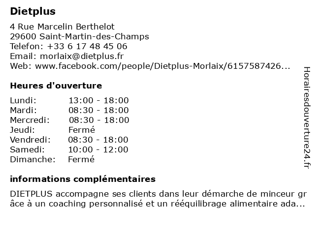 2 Dietplus (Distance: 32,28 km) 63 Quai de Cornouaille, 29800 Landerneau alimentation, dietplus, diététique, fitness, nutrition 3 Dietplus (Distance: 34,12 km) 10 Bis Avenue du Général de Gaulle, 22300 Lannion alimentaire, centre, dietplus, diététicien, diététique, régime, rééquilibrage 4 Dietplus (Distance: 38,27 km) 23 place du Champ de Foire, 29270 Carhaix Plouguer alimentation, dietplus, diététique, fitness, nutrition 5 Dietplus (Distance: 39,87 km) 679 rue Ernest-Renan, 22700 Perros-Guirec bilan nutritionnel, centres dietplus, dietplus, poids ideal, produits, suivi 6 Dietplus (Distance: 50,25 km) 6 rue de la 2ème DB, 29200 Brest diet, dietplus, fitness, thinning, wellness |