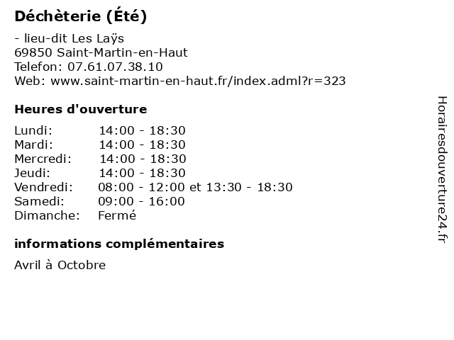 1 Déchèterie (Été) (Distance: 11,97 km) - lieu-dit Le Jonan, 69440 Mornant bennes, déchets, déchèterie, détritus, gravats, été 2 Déchèterie (Été) (Distance: 12,73 km) - lieu-dit La Brévenne, 69690 Courzieu bennes, déchets, déchèterie, détritus, gravats, été 3 Déchèterie (Été) (Distance: 17,10 km) - lieu-dit les Auberges, 69770 Montrottier bennes, déchets, déchèterie, détritus, gravats, été 4 Déchèterie (Été) (Distance: 18,88 km) - Zone Artisanale les Flaches, 42330 Saint-Galmier bennes, déchets, déchèterie, détritus, gravats, été 5 Déchèterie (Hiver) (Distance: 0,00 km) - lieu-dit Les Laÿs, 69850 Saint-Martin-en-Haut bennes, déchets, déchèterie, détritus, gravats, hiver 6 Un dimanche à la Campagne (été) (Distance: 4,19 km) s/n La Durantière, 69510 Thurins boutiques, campagne, dimanche, fruits, la, légumes, paysannes, un, été |