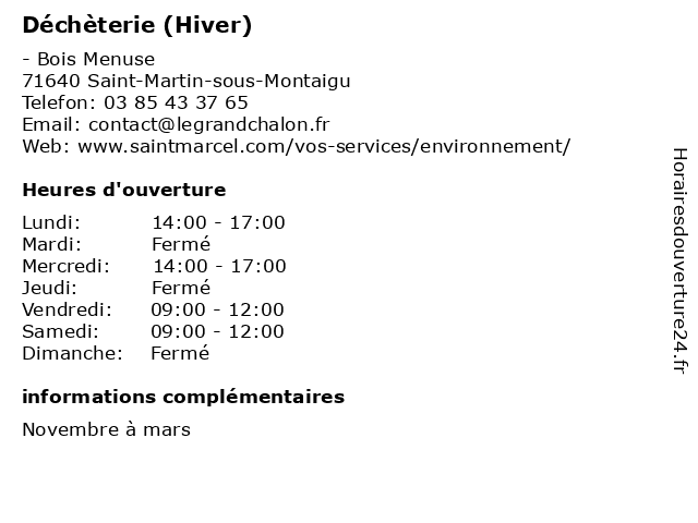 1 Déchèterie (Hiver) (Distance: 5,13 km) - lieu-dit Pièces Bourgeoises, 71640 Givry bennes, débarras, déchèterie, détritus, hiver, ordures 2 Déchèterie (Hiver) (Distance: 5,78 km) - lieu-dit Les Peupliers, 71150 Fontaines bennes, débarras, déchèterie, détritus, hiver, ordures 3 Déchèterie (Hiver) (Distance: 7,40 km) - Prairie des Marots, 71510 Saint-Léger-Sur-Dheune bennes, débarras, déchèterie, détritus, hiver, ordures 4 Déchèterie (Hiver) (Distance: 7,48 km) - ZA des Champs Rouges, 71150 Rully bennes, débarras, déchèterie, détritus, hiver, ordures 5 Déchèterie (Hiver) (Distance: 9,33 km) 138 rue Lavoisier, 71100 Saint-Rémy bennes, débarras, déchèterie, détritus, hiver, ordures 6 Déchèterie (Hiver) (Distance: 14,76 km) - lieu-dit Le Vernat, 71380 Saint-Marcel bennes, débarras, déchèterie, détritus, hiver, ordures |
