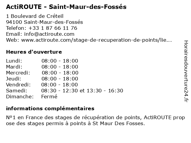 | Samedi | 08:30-12:30 et 13:30-16:30 |