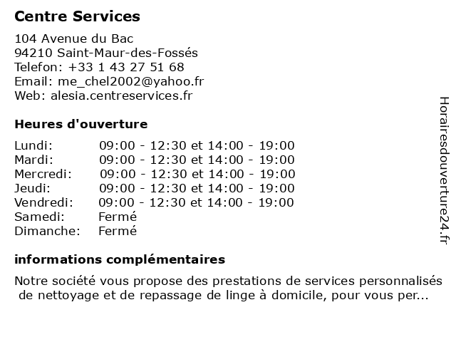 1 Centre Services (Distance: 2,06 km) 1 place des Marronniers, 94100 Saint-Maur-des-Fossés administratives, agence, centre, intervenant, qualité, services 2 Centre Services (Distance: 2,41 km) 8 rue du Temple, 94370 Sucy-en-Brie agence, centre, femme de ménage, garde d'enfants, ménage, repassage, service à la personne, services, à domicile 3 Centre Services (Distance: 5,68 km) 55 Avenue Ledru Rollin, 94170 Le Perreux-sur-Marne centre, services 5 Centre Services (Distance: 13,11 km) 124 rue du Général Leclerc, 77170 Brie-Comte-Robert agées, aide, centre, domicile, handicap, la, ménage, particuliers, personne, personnes, services |