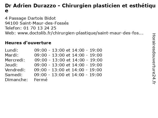 1 Dr Adrien Ohayon - Chirurgien-dentiste (Distance: 0,20 km) 25 Rue de la Varenne, 94100 Saint-Maur-des-Fossés adrien, chirurgien, dentaire, dentiste, dr, implantologie, ohayon, parodontologie 2 Dr Franck Faramarz - Chirurgien plasticien et esthétique (Distance: 0,36 km) 48 Rue d'Alsace Lorraine, 94100 Saint-Maur-des-Fossés chirurgien, consultation, docteur, dr, esthétique, et, faramarz, franck, med, médecin, plasticien, traitement 3 Dr Adrien Durand - Médecin généraliste (Distance: 1,24 km) 69 bis Avenue de la République, 94100 Saint-Maur-des-Fossés adrien, consultations, docteur, dr, durand, généraliste, médecin, médical 4 Dr Barbara Hersant - Chirurgien plasticien et esthétique (Distance: 1,88 km) 51 Avenue du Maréchal de Lattre de Tassigny, 94000 Créteil barbara, chirurgien, consultation, docteur, dr, esthétique, et, hersant, med, medecine, medical, médecin, plasticien, traitement 5 Dr Romain Bosc - Chirurgien plasticien et esthétique (Distance: 1,88 km) 51 Avenue du Maréchal de Lattre de Tassigny, 94000 Créteil bosc, chirurgien, consultation, docteur, dr, esthétique, et, med, medecine, medical, médecin, plasticien, romain, traitement 6 Dr Simone la Padula - Chirurgien plasticien et esthétique (Distance: 1,89 km) 51 Avenue du Maréchal de Lattre de Tassigny, 94000 Créteil chirurgien, dr, esthétique, et, la, padula, plasticien, simone  |