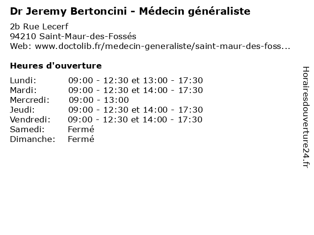 1 Dr Juliette Badie Bertoncini - Cardiologue (Distance: nan km) 2B Rue Lecerf, 94210 Saint-Maur-des-Fossés badie, bertoncini, cardio, cardiologie, cardiologue, coeur, dr, juliette 2 Dr Jeremy Nuham - Vétérinaire (Distance: 1,30 km) 93 Avenue du Bac, 94210 Saint-Maur-des-Fossés animaux, clinique, dr, jeremy, médical, nuham, santé, soins, vétérinaire 3 Jeremy Derhy - Audioprothésiste (Distance: 2,43 km) 32 Rue de l'Église, 94500 Champigny-sur-Marne 94500, acousticien, afflelou, alain, audioprothésiste, champigny, derhy, jeremy, marne 4 Dr Jeremy Roussel - Médecin généraliste - secrétariat (Distance: 4,29 km) 26 Rue de Sucy, 94470 Boissy-Saint-Léger consultation, docteur, dr, généraliste, jeremy, med, médecin, médecine, roussel, secrétariat, traitement 5 Dr Jeremy-Philippe Bertoncini - Gastro-entérologue et hépatologue (Distance: 4,67 km) 51 Avenue du Maréchal de Lattre de Tassigny, 94000 Créteil bertoncini, consultation, docteur, dr, entérologue, et, gastro, hépatologue, jeremy, med, medecine, medical, médecin, philippe, traitement 6 Jeremy Cohen - Ostéopathe (Distance: 7,95 km) 13 Rue Clément Vienot, 94300 Vincennes care, clinic, cohen, dentist, france, gynécologue, health, jeremy, kinesitherapeute, ophtalmologiste, orl, ostéopathe, psychologue, service |