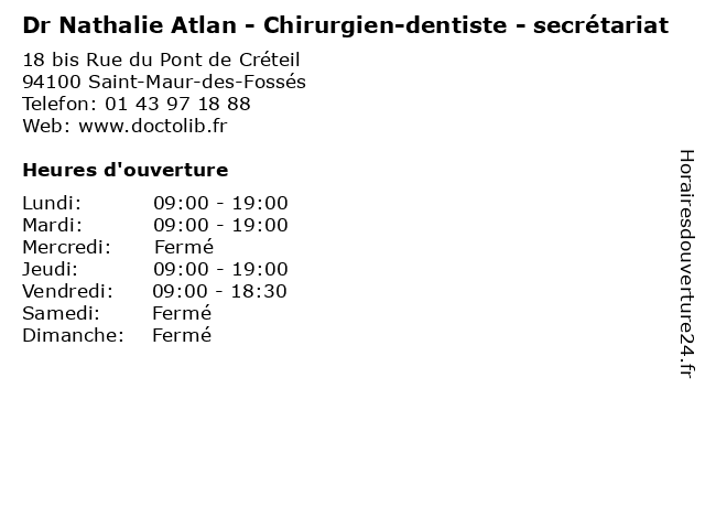 1 Dr Nathalie Imbert - Chirurgien-dentiste - secrétariat (Distance: 0,79 km) 65 Rue de Paris, 94340 Joinville-le-Pont chirurgien, chirurgien-dentiste, dentiste, dr, imbert, médecins, médicaments, nathalie, santé, secrétariat, spécialiste 2 Maître Nathalie Ferreira - Avocate (Distance: 1,05 km) 106 Avenue de Condé, 94100 Saint-Maur des Fossés avocate, avocats, civils, droits, ferreira, juridiques, maître, nathalie 3 Nathalie Perrot-Minnot Lyonnet - Pédicure-podologue (Distance: 1,22 km) 32 Avenue Emile Zola, 94100 Saint-Maur-des-Fossés lyonnet, minnot, nathalie, orthoplastie, perrot, podologue, pédicure, pédicurie 4 Dr Nathalie Wrona Atlani - Rhumatologue (Distance: 1,79 km) 51 Avenue du Maréchal de Lattre de Tassigny, 94000 Créteil atlani, consultation, docteur, dr, med, medecine, medical, médecin, nathalie, rhumatologue, traitement, wrona 5 Dr Nathalie Guigui - Cardiologue (Distance: 2,08 km) 92 Avenue du Général de Gaulle, 94000 Créteil 94000, cardiologue, cardiomédical, créteil, dr, guigui, nathalie 6 Dr Nathalie Perrodin - Médecin généraliste - secrétariat (Distance: 2,12 km) 172 Boulevard de Créteil, 94100 Saint-Maur-des-Fossés consultation, docteur, dr, généraliste, med, médecin, médecine, nathalie, perrodin, secrétariat, traitement |