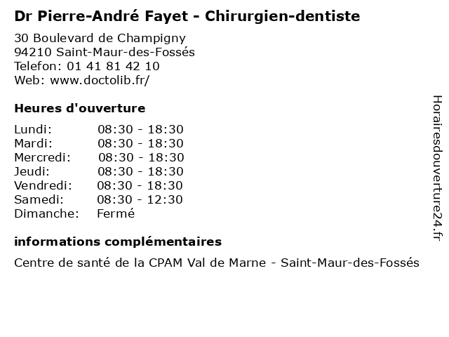 1 Dr Pierre-André Fayet - Chirurgien-dentiste (Distance: 12,39 km) 96-98 Rue du Faubourg du Temple, 75011 Paris andré, chirurgien, consultation, dentiste, docteur, dr, fayet, med, médecin, médecine, pierre, traitement 2 Dr Pierre-André Fayet - Chirurgien-dentiste - secrétariat (Distance: 0,00 km) 30 Boulevard de Champigny, 94100 Saint-Maur-des-Fossés andré, chirurgien, consultation, dentiste, docteur, dr, fayet, med, médecin, médecine, pierre, secrétariat, traitement 3 Dr André De Araujo Vieira - Chirurgien-dentiste (Distance: 1,68 km) 26ter Rue Jean Jaurès, 94500 Champigny-sur-Marne andré, araujo, chirurgien, de, dent, dentiste, docteur, dr, soins, vieira 4 Dr André Sousa da Costa - Chirurgien-dentiste (Distance: 1,90 km) 48 Rue du Général de Gaulle, 94430 Chennevières-sur-Marne andré, chirurgien, chirurgien-dentiste, costa, da, dentiste, dr, médecins, médicaments, santé, secrétariat, sousa, spécialiste 5 École élémentaire publique André Le Notre (Distance: 2,74 km) . Rue André Le Notre, 94490 Ormesson-sur-Marne andré, ecole, education, le, notre, publique, services, école, élémentaire 6 Médiathèque André Malraux (Distance: 3,26 km) 3 3 mail Rodin, 94500 Champigny-sur-Marne andré, cd audio, cd.rom, livres, malraux, médiathèque, revues |