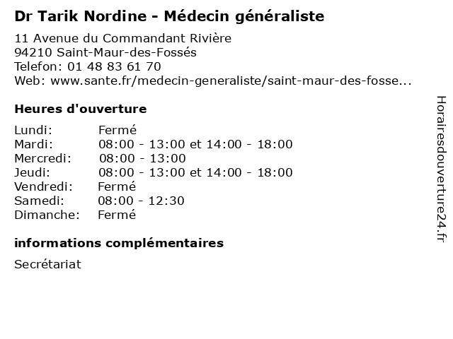 | Jeudi | 08:00-13:00 et 14:00-18:00 |