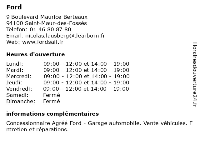 1 Ford - Véhicules Neufs (Distance: 0,00 km) 9 Boulevard Maurice Berteaux, 94100 Saint-Maur-des-Fossés atelier de carrosserie, auto, car, financement, ford, ford entreprise, neufs, pièces et accessoires, véhicules, véhicules d’occasion, véhicules neufs 2 Ford - Véhicules d’Occasion (Distance: 0,00 km) 9 Boulevard Maurice Berteaux, 94100 Saint-Maur-des-Fossés atelier de carrosserie, auto, car, d’occasion, financement, ford, ford entreprise, pièces et accessoires, véhicules, véhicules d’occasion, véhicules neufs 3 SAFI - PRECISION AUTOMOBILES (Ford Entreprise) (Distance: 0,19 km) 9 Boulevard Maurice Berteaux, 94100 Saint Maur des Fossés automobiles, entreprise, entretien, ford, precision, révisions, safi, services d'automobiles, vidanges 4 SAFI - PRECISION AUTOMOBILES (Ford Entreprise) (Distance: 4,25 km) 2/4 Avenue du Président Salvador Allende, 94400 Vitry sur Seine automobiles, entreprise, entretien, ford, precision, révisions, safi, services d'automobiles, vidanges 5 Tom Ford (Distance: 18,54 km) 134 Avenue de la Plaine de France, 95500 Gonesse beaute, bijoux, chaussures, enfants, ford, maison, mode femme, mode homme, restaurant, service, sport, tom 6 Ford - Arnold Bauer SA - Véhicules Neufs (Distance: 19,31 km) 19-25 Avenue de Stalingrad, 92700 Colombes arnold, bauer, ford, neufs, révisions, sa, service, services, services d'automobiles, véhicules |