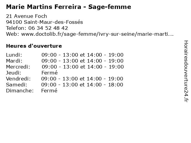 1 Marie Martins Ferreira - Sage-femme (Distance: 8,11 km) 18 Rue Marceau, 94200 Ivry-sur-Seine femme, ferreira, marie, martins, medical, sage, sagefemme 2 Maître Nathalie Ferreira - Avocate (Distance: 0,67 km) 106 Avenue de Condé, 94100 Saint-Maur des Fossés avocate, avocats, civils, droits, ferreira, juridiques, maître, nathalie 3 Dr Tiago Cardoso Ferreira - Chirurgien-dentiste (Distance: 2,13 km) 14 Avenue du Mesnil, 94210 Saint-Maur-des-Fossés cardoso, chirurgien, consultation, dentiste, docteur, dr, ferreira, med, médecin, tiago, traitement 4 Weksiley Silva Ferreira (Distance: 2,83 km) 19 Cité André Joly, 94500 Champigny-sur-Marne ferreira, silva, weksiley 5 Joao Rafael Ferreira - Masseur-kinésithérapeute (Distance: 3,51 km) 6 Allée Victor Baltard,, 94130 Nogent-sur-Marne docteur, ferreira, joao, kine, kinesitherapeute, kinésithérapeute, masseur, rafael 6 Carla Rosa Martins - Masseur-kinésithérapeute (Distance: 3,59 km) 26 Avenue du 8 Mai 1945, 94500 Champigny-sur-Marne bien-être, carla, en, forme, kinésithérapeute, kinésithérapie, martins, masseur, remise, rosa, rééducation |
