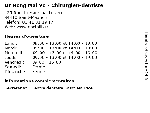 1 Dr Hong Dan Tran - Chirurgien-dentiste (Distance: 0,00 km) 125 Rue du Maréchal Leclerc, 94410 Saint-Maurice cabinet, chirurgien, dan, dentaire, dentiste, dr, hong, soins, tran 2 Dr Thi Mai Anh Kim - Médecin généraliste (Distance: 2,12 km) 62 Avenue de la République, 94700 Maisons-Alfort anh, docteur, dr, generaliste, généraliste, kim, mai, medical, médecin, soin, thi 3 Pharmacie de la Liberté - Vo (Distance: 3,27 km) 54 Avenue de la Liberté, 94700 Maisons Alfort de, herboristerie, la, liberté, médicaments, paramédical, parapharmacie, pharmacie, pharmacien, santé, traitements, vo 4 Château Vincennes - Du 22 septembre au 20 mai (Distance: 3,62 km) 1 Avenue de Paris, 94300 Vincennes 20, 22, ancien, art, au, chateau, château, du, mai, musee, septembre, vincennes 5 Château Vincennes - Du 21 mai au 21 septembre (Distance: 3,62 km) 1 Avenue de Paris, 94300 Vincennes 21, ancien, art, au, chateau, château, du, mai, musee, septembre, vincennes 6 Château Vincennes - Sainte-Chapelle / Du 21 mai au 21 septembre (Distance: 3,62 km) 1 Avenue de Paris, 94300 Vincennes 21, ancien, art, au, chapelle, chateau, château, du, mai, musee, sainte, septembre, vincennes |
