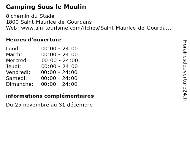 1 Camping Sous le Moulin (Réception) (Distance: 0,00 km) 8 chemin du Stade, 01800 Saint-Maurice-de-Gourdans camping, hebergement, le, moulin, restauration, réception, sous, tourisme 2 Camping les Plages de l'Ain (Distance: 1,21 km) 11 Chemin du Stade, 01800 Saint-Maurice-de-Gourdans camping, de, hebergement, l'ain, les, plages, tourisme 3 Camping les Plages de l'Ain - Réception (du 8 janvier au 14 mars et du 1er octobre au 30 novembre) (Distance: 1,21 km) 11 Chemin du Stade, 01800 Saint-Maurice-de-Gourdans 14, 1er, 30, au, camping, de, du, et, hebergement, janvier, l'ain, les, mars, novembre, octobre, plages, réception, tourisme 4 Camping les Plages de l'Ain - Réception (du 15 mars au 31 mai et en septembre) (Distance: 1,21 km) 11 Chemin du Stade, 01800 Saint-Maurice-de-Gourdans 15, 31, au, camping, de, du, en, et, hebergement, l'ain, les, mai, mars, plages, réception, septembre, tourisme 5 Camping les Plages de l'Ain - Réception (de juin à août) (Distance: 1,21 km) 11 Chemin du Stade, 01800 Saint-Maurice-de-Gourdans août, camping, de, hebergement, juin, l'ain, les, plages, réception, tourisme 6 Camping La Régnière (Distance: 5,17 km) 23 Chemin des Eglantiers, 38280 Villette d'Anthon camping, hébergement, la, régnière, tourisme |