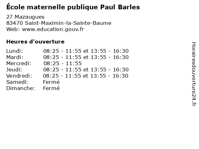 1 École Maternelle Publique Paul Barles (Distance: 0,06 km) 27 Route de Mazaugues, 83470 Saint-Maximin-la-Sainte-Baume barles, cours, education, maternelle, paul, publique, services, École, école 2 École Maternelle Publique Paul Verlaine (Distance: 1,07 km) - Chemin des Vertus, 83470 Saint-Maximin-la-Sainte-Baume cours, education, maternelle, paul, publique, services, verlaine, École, école 3 École Primaire Publique Paul Barles (Distance: 1,34 km) . Route de Mazaugues, 83470 Saint-Maximin-la-Sainte-Baume barles, cours, education, paul, primaire, publique, services, École, école 4 Mancini Paul (Distance: 3,08 km) 493 Chemin de Rebubeou, 83470 Saint-Maximin-la-Sainte-Baume mancini, paul 5 École Primaire Publique Paul Cézanne (Distance: 14,02 km) - Boulevard Bernard Palissy, 83640 Saint-Zacharie cours, cézanne, education, paul, primaire, publique, services, École, école 6 École élémentaire publique Paul Cézanne (Distance: 14,07 km) . Palissy, 83640 Saint-Zacharie cours, cézanne, paul, publique, services, école, élémentaire |