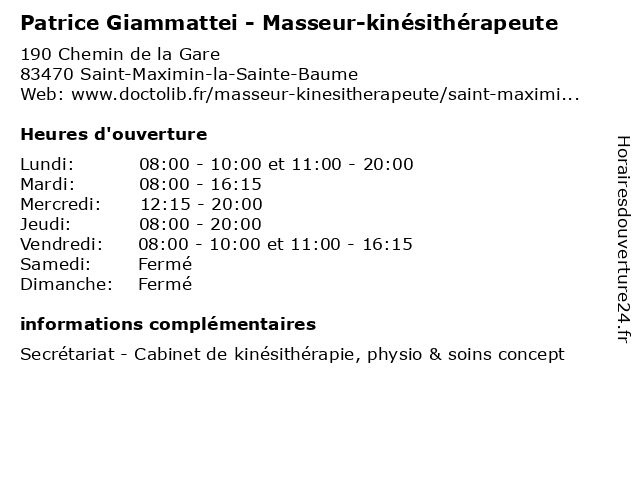 1 Patrice Russo Immobilier (Distance: 0,54 km) 9 Avenue Albert 1er, 83470 Saint-Maximin-la-Sainte-Baume agence, appartement, gestion, immobilier, location, maison, patrice, russo, transactions, vente 2 Dr. Patrice Alcaraz- Rhumatologie (Distance: 29,30 km) 12 Cours Voltaire, 13400 Aubagne alcaraz, consultation, docteur, dr., patrice, rhumatologie, santé 3 Dr. Patrice Lambert - Dentiste (Distance: 31,47 km) 23 Rue de Horloge, 13860 Peyrolles-en-Provence dentiste, docteur, dr., lambert, medecins, patrice, sante 4 Dr. Patrice Godard- Ophtalmologie (Autre) (Distance: 38,77 km) 50 avenue des Caillols, 13012 Marseille autre, consultation, docteur, dr., godard, ophtalmologie, patrice, santé 5 Dr. Patrice Assante - Dentiste (Distance: 41,95 km) . Avenue Georges Pompdiou, 04100 Manosque assante, dentiste, docteur, dr., medecins, patrice, sante 6 Dr. Patrice Durand- Médecine générale (Consultation libre) (Distance: 47,94 km) 20 cours Saint Etienne, 13840 Rognes consultation, docteur, dr., durand, générale, libre, médecine, patrice, santé |