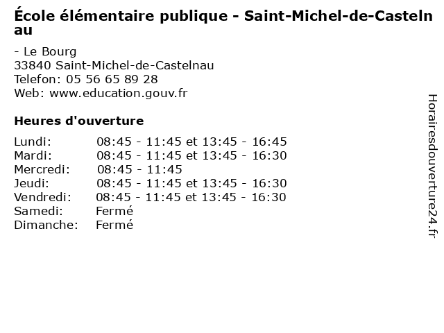 | Mardi | 08:45-11:45 et 13:45-16:30 |