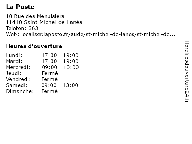3 La Poste (Distance: 7,82 km) 46 Grand Rue, 11320 Labastide-d'Anjou agence, assurance, banque, banque postale, bureau de poste, chronopost, colis, courrier, dps, expéditions internationales, la, point, postale, poste, relais, timbres, téléphonie, ups, western union 4 La Poste (Distance: 8,88 km) - Square Général de Gaulle, 31290 Villefranche-de-Lauragais colis, express chronopost, expédition, la, poste, réexpédition internationale, service, suivi du courrier 6 La Poste (Distance: 9,46 km) 34 Rue de la République, 31290 Gardouch colis, express chronopost, expédition, la, poste, réexpédition internationale, service, suivi du courrier |